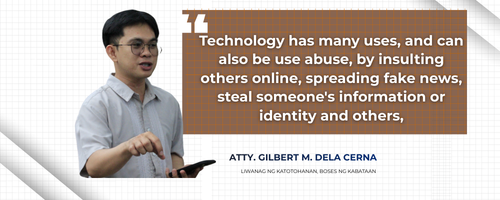 “Technology has many uses, and can also be use abuse, by insulting others online, spreading fake news, steal someone’s information or identity and others,” saad ni Atty. Dela Cerna.
